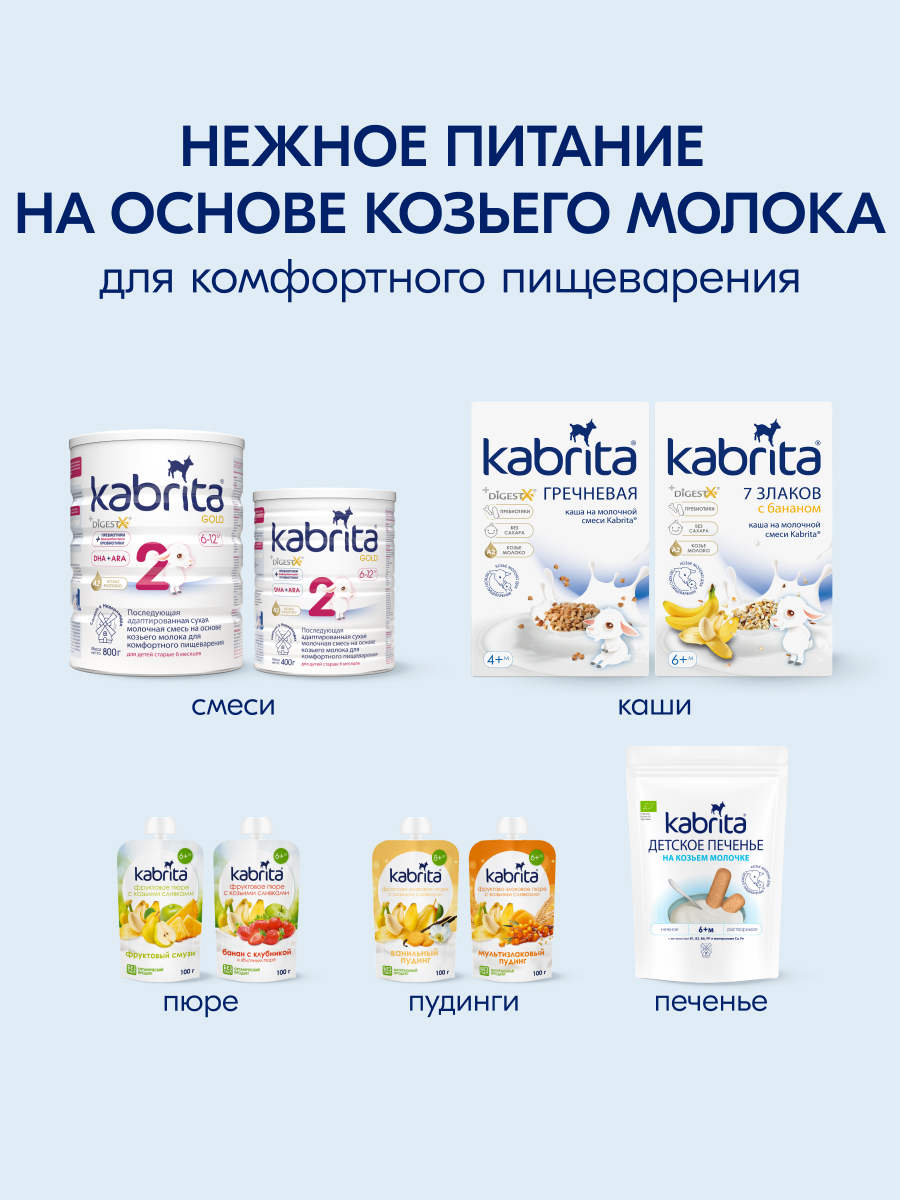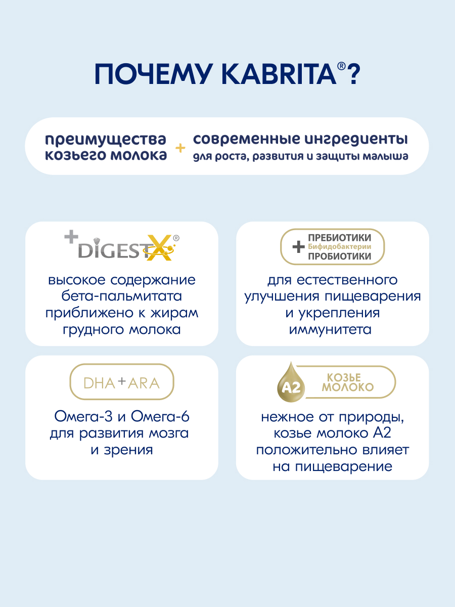 Благодаря голландским фермерским традициям и многолетнему опыту производства (с 1897 года), Kabrita предлагает современное высококачественное детское питание из козьего молока. Нежное от природы, козье молоко является отличной основой для производства детского питания. Козье молоко переваривается и усваивается быстрее и легче коровьего, что помогает более легкому и комфортному пищеварению. Kabrita – это преимущества козьего молока и современные функциональные ингредиенты для роста, развития и защиты малыша.