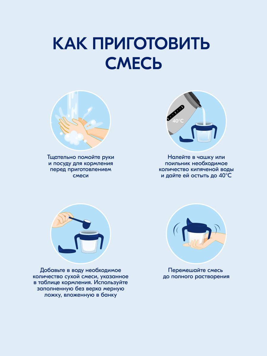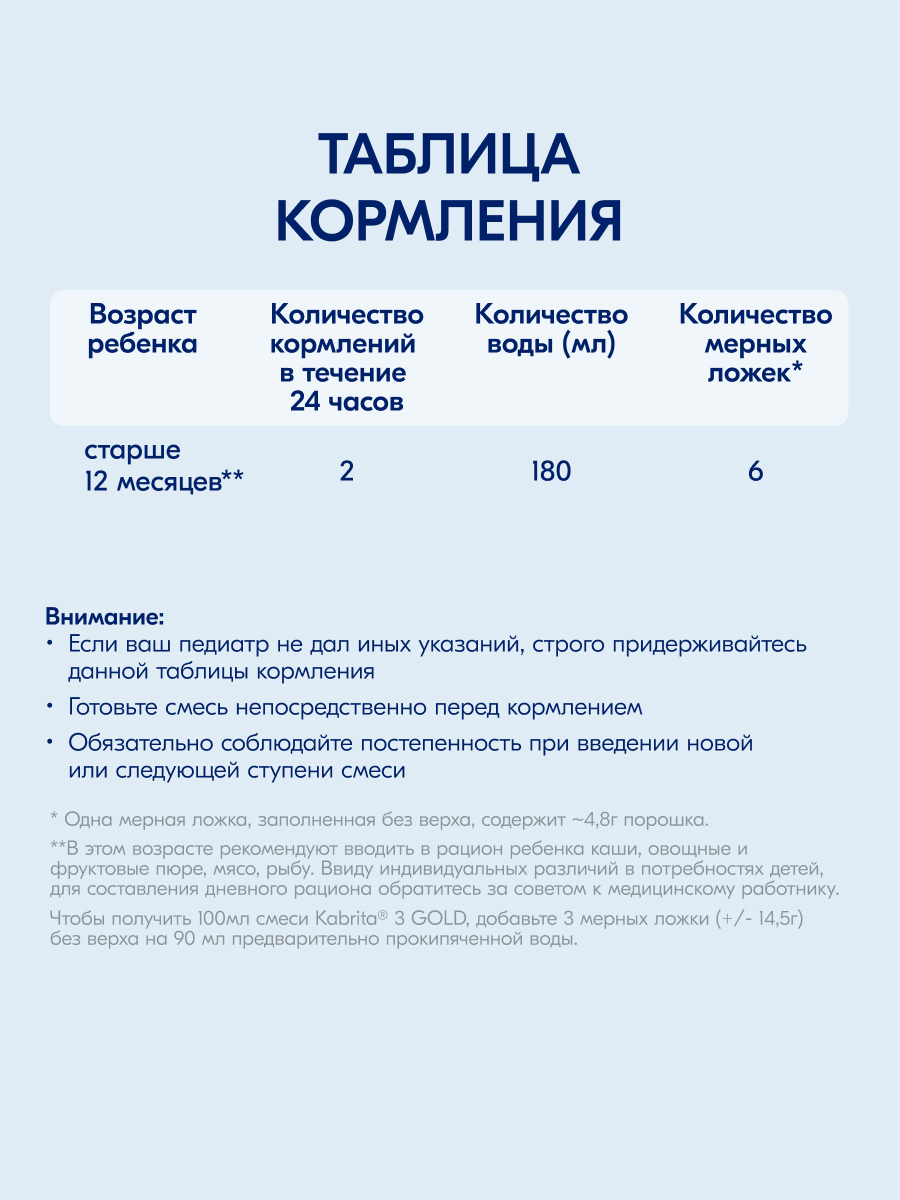 Точно следуйте инструкциям на банке. Несоблюдение инструкций по приготовлению смеси может нанести вред здоровью ребенка. Всегда проверяйте температуру готовой смеси перед кормлением, капнув ее на внутреннюю сторону запястья. Никогда не используйте остатки разведенной детской смеси для последующего кормления! Во время кормления необходимо поддерживать ребенка, чтобы он не поперхнулся. Использование некипяченой воды, нестерилизованной посуды, неправильное хранение, транспортировка, приготовление и кормление может привести к неблагоприятным последствиям для здоровья ребенка. Kabrita 3 GOLD не является заменителем женского молока и строго не рекомендуется для детей младше 12 месяцев.