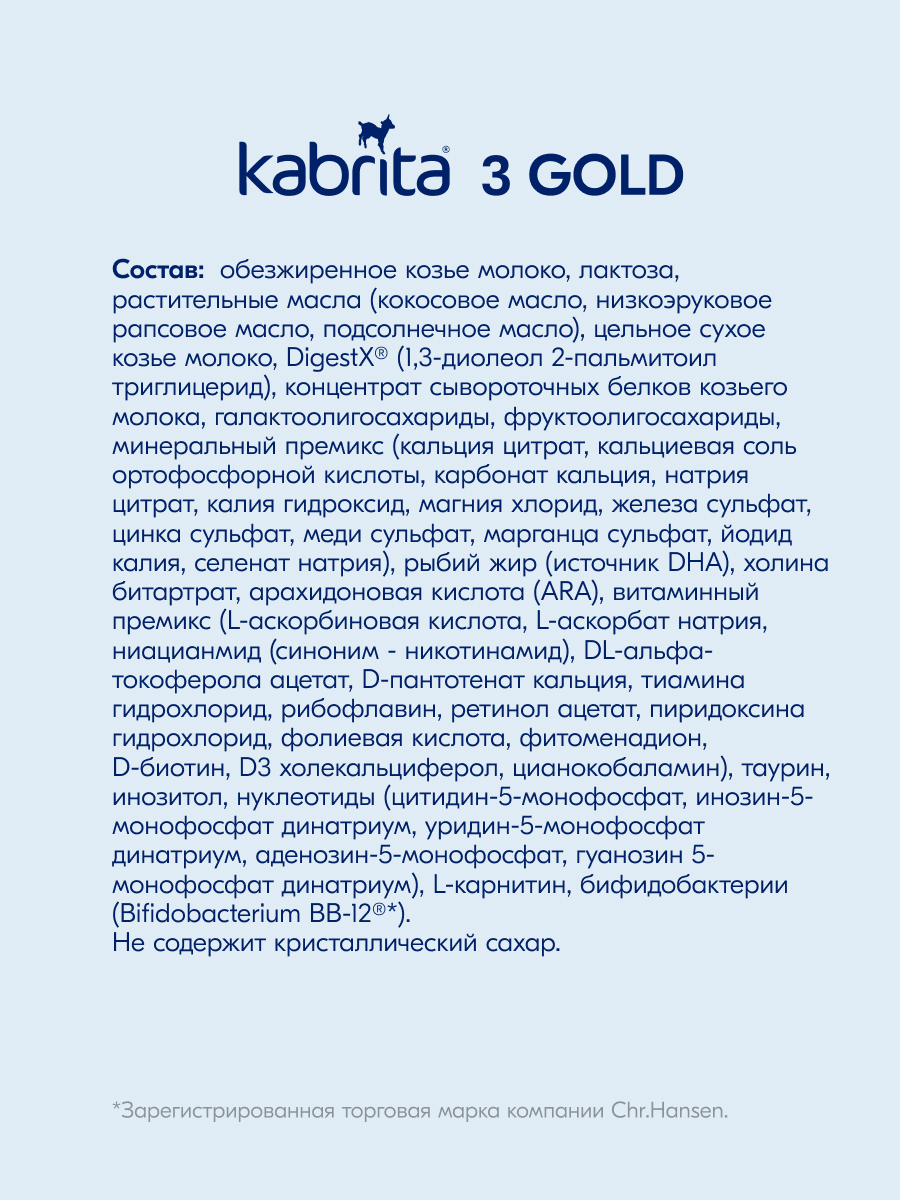 Kabrita 3 GOLD - нежное и вкусное детское молочко на основе натурального полезного козьего молока для здоровых детей с 12 месяцев. Kabrita 3 GOLD производится из полезного козьего молока с добавлением ценнейших сывороточных белков козьего молока, комплекса DigestX, пребиотиков (ФОС, ГОС), пробиотиков (бифидобактерии Bifidobacterium BB-12), DHA и ARA, нуклеотидов. В период активного роста и развития малышу особенно необходимо здоровое и сбалансированное питание, удовлетворяющее возросшие потребности ребенка этого возраста. Всего две порции Kabrita 3 GOLD в день содержат 54% кальция, 40% железа и 54% витамина D (% от суточной потребности).