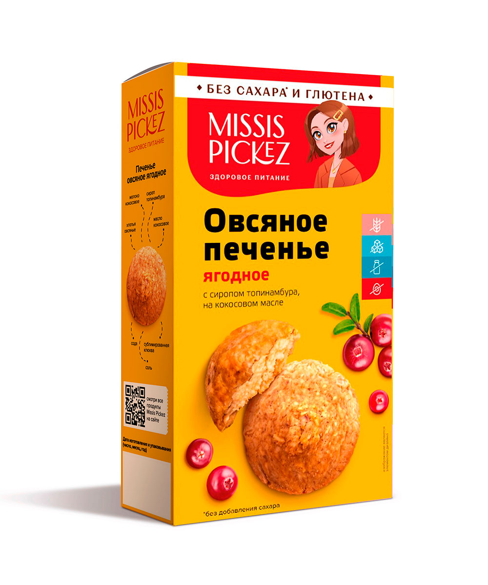 Состав: овсяные хлопья, сироп топинамбура (клубни топинамбура, вода), масло кокосовое рафинированное, молоко кокосовое, вода, клюква сублимированная, разрыхлитель сода пищевая, соль морская пищевая, сахарозаменитель аллюлоза. Пищевая ценность 100 г продукта (средние значения): белки 5 г; жиры 23 г; углеводы 45 г. Энергетическая ценность: 420 ккал/кДж 1740