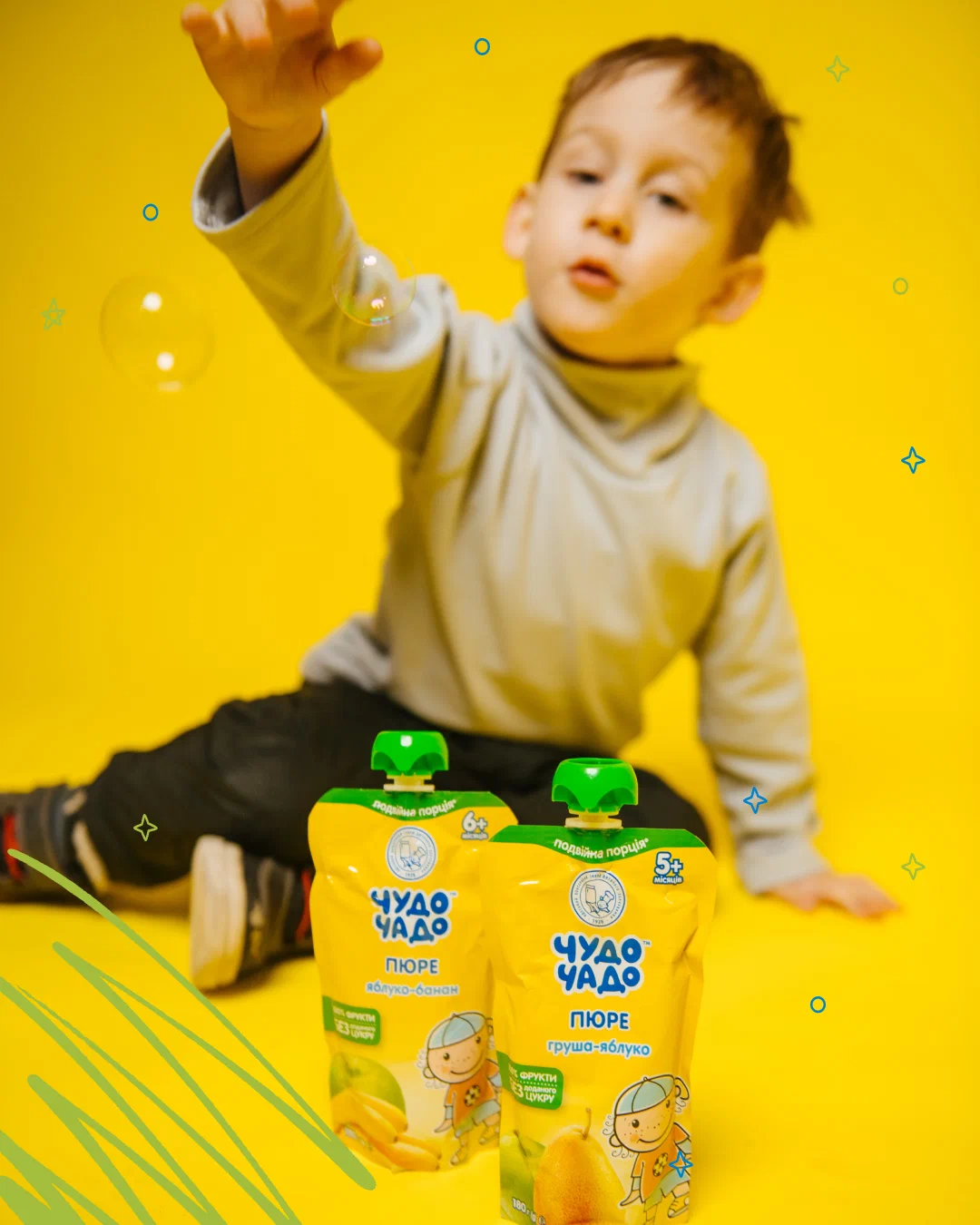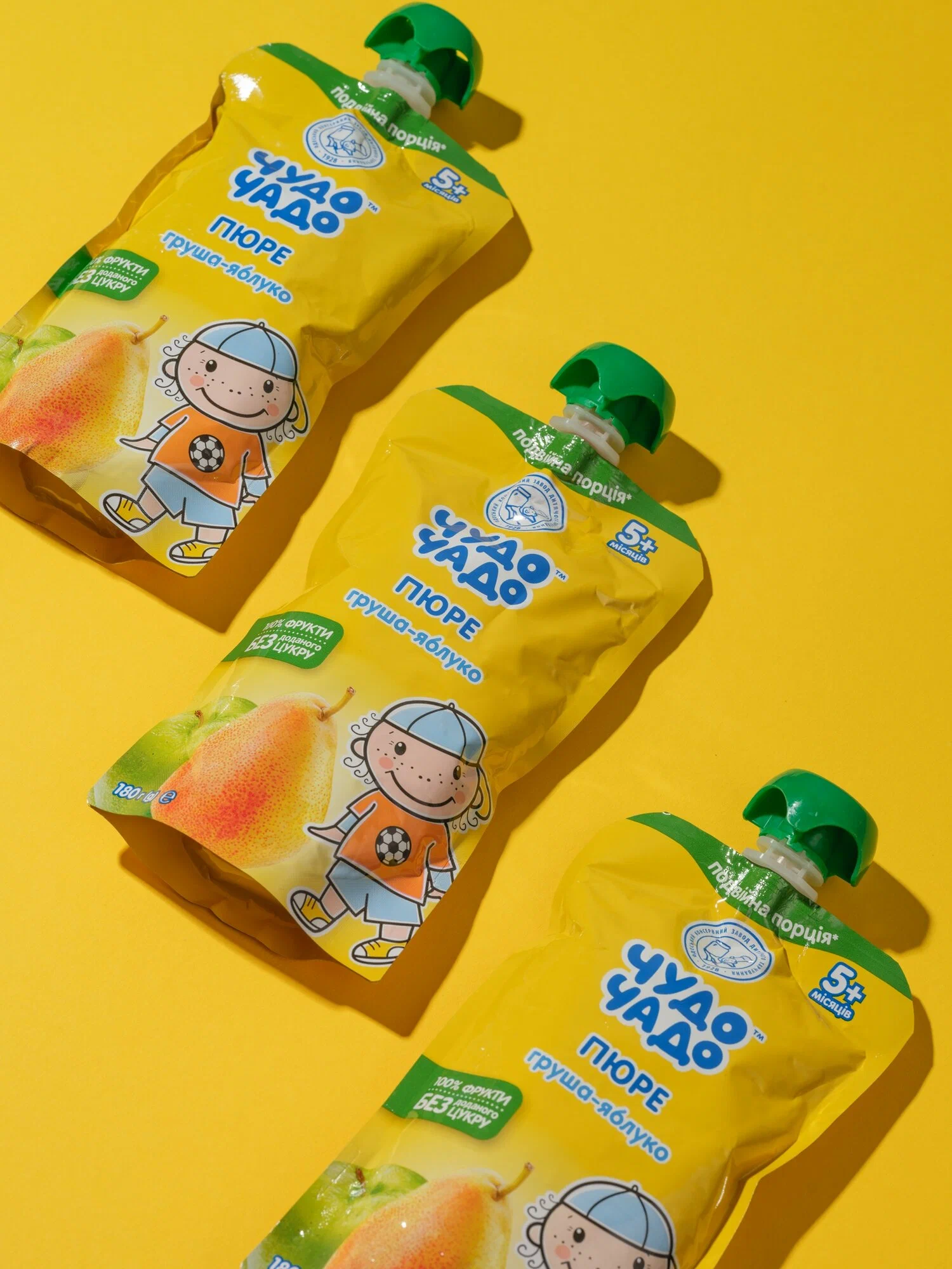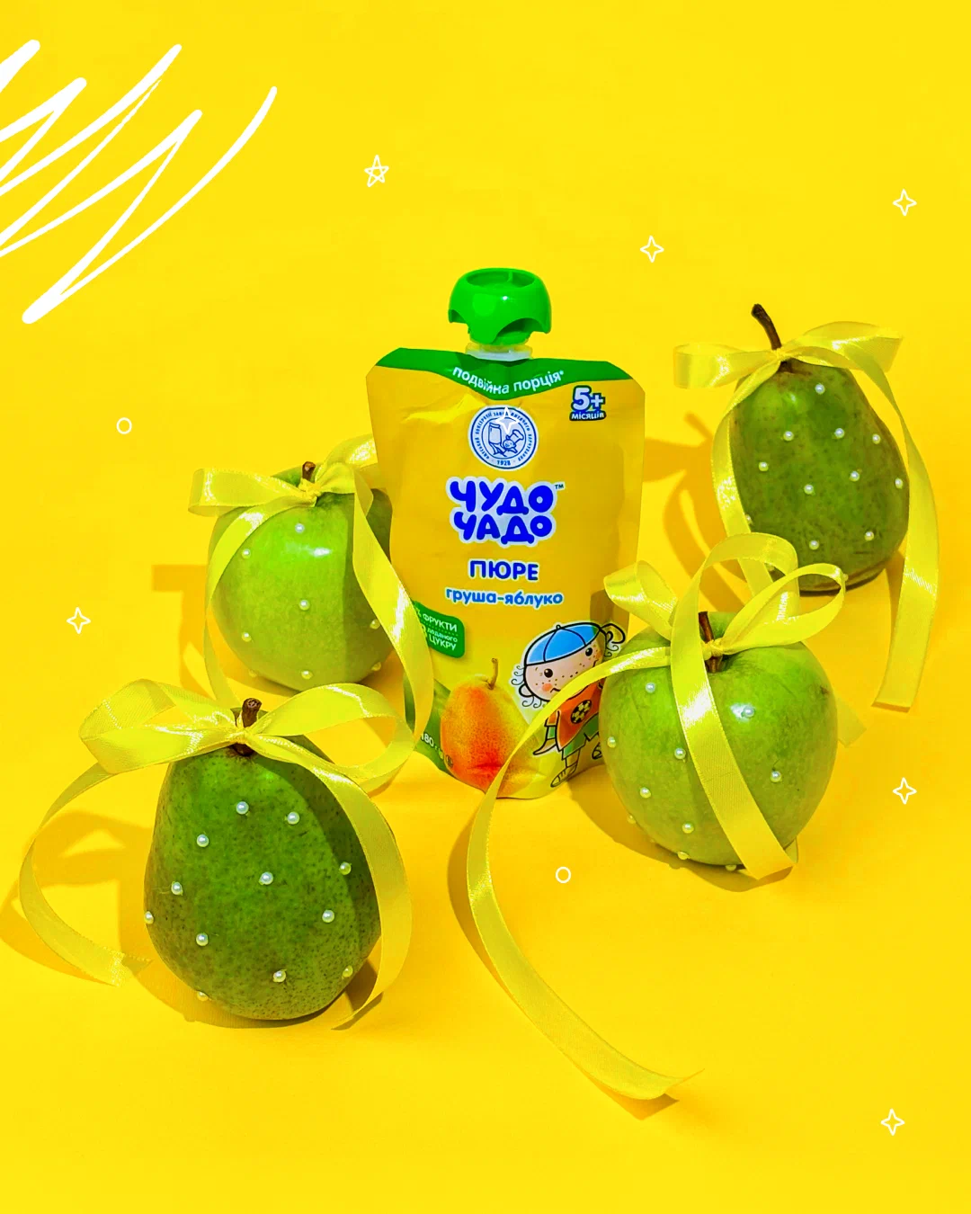 Фруктовое пюре «Чудо-Чадо» груша-яблоко, 90 г – это натуральный и вкусный продукт для детей с 5 месяцев. Изготовлено из отборных украинских груш и яблок без добавления сахара, консервантов, красителей и ГМО. Пюре богато витаминами (С, группы B), минералами (калий, магний) и клетчаткой, которые поддерживают иммунитет, способствуют здоровому пищеварению и развитию малыша.Нежная однородная текстура и естественный сладковатый вкус делают его идеальным для прикорма. Удобная упаковка-пауч с безопасной крышкой позволяет брать пюре на прогулку, а ребенок может кушать самостоятельно.
