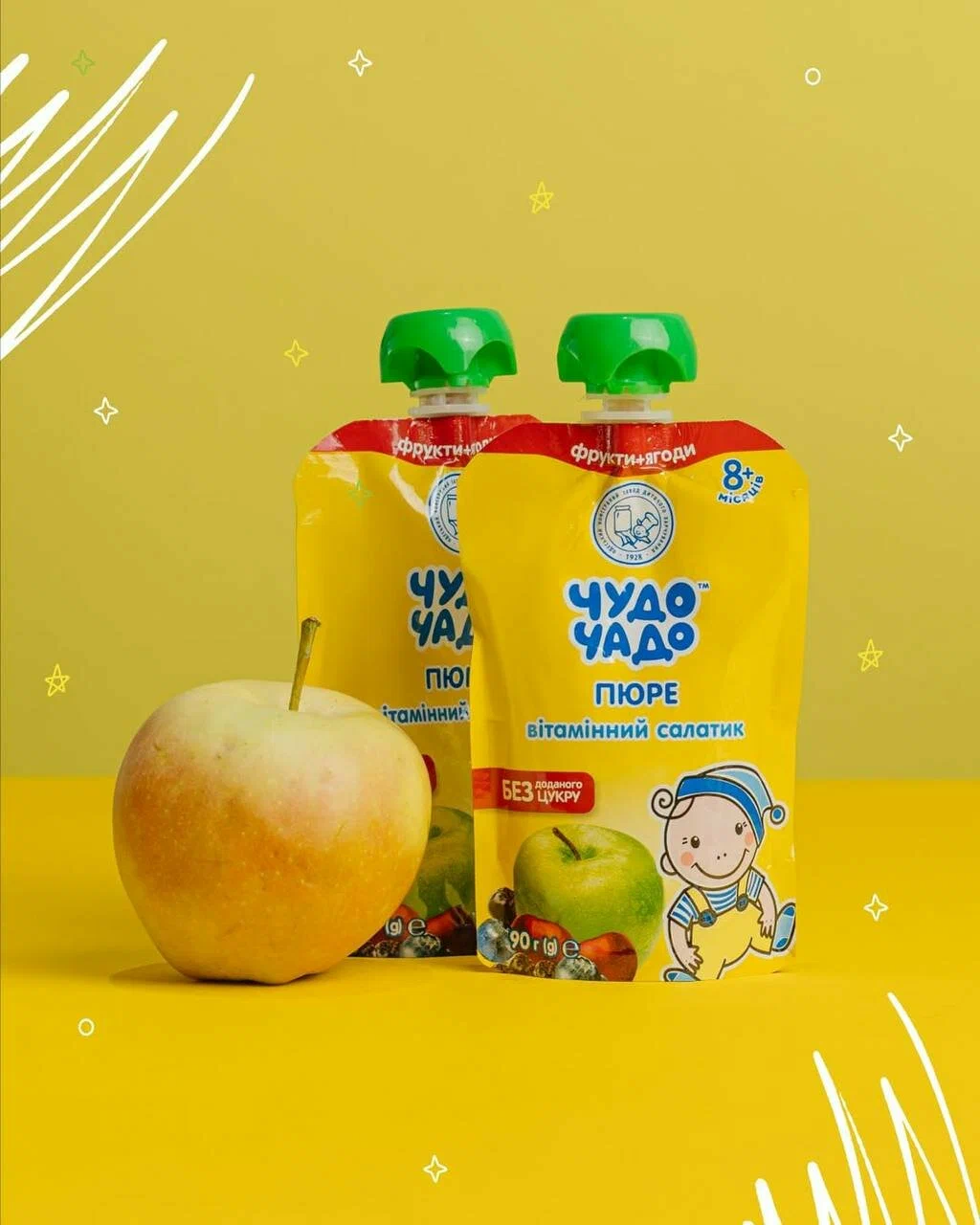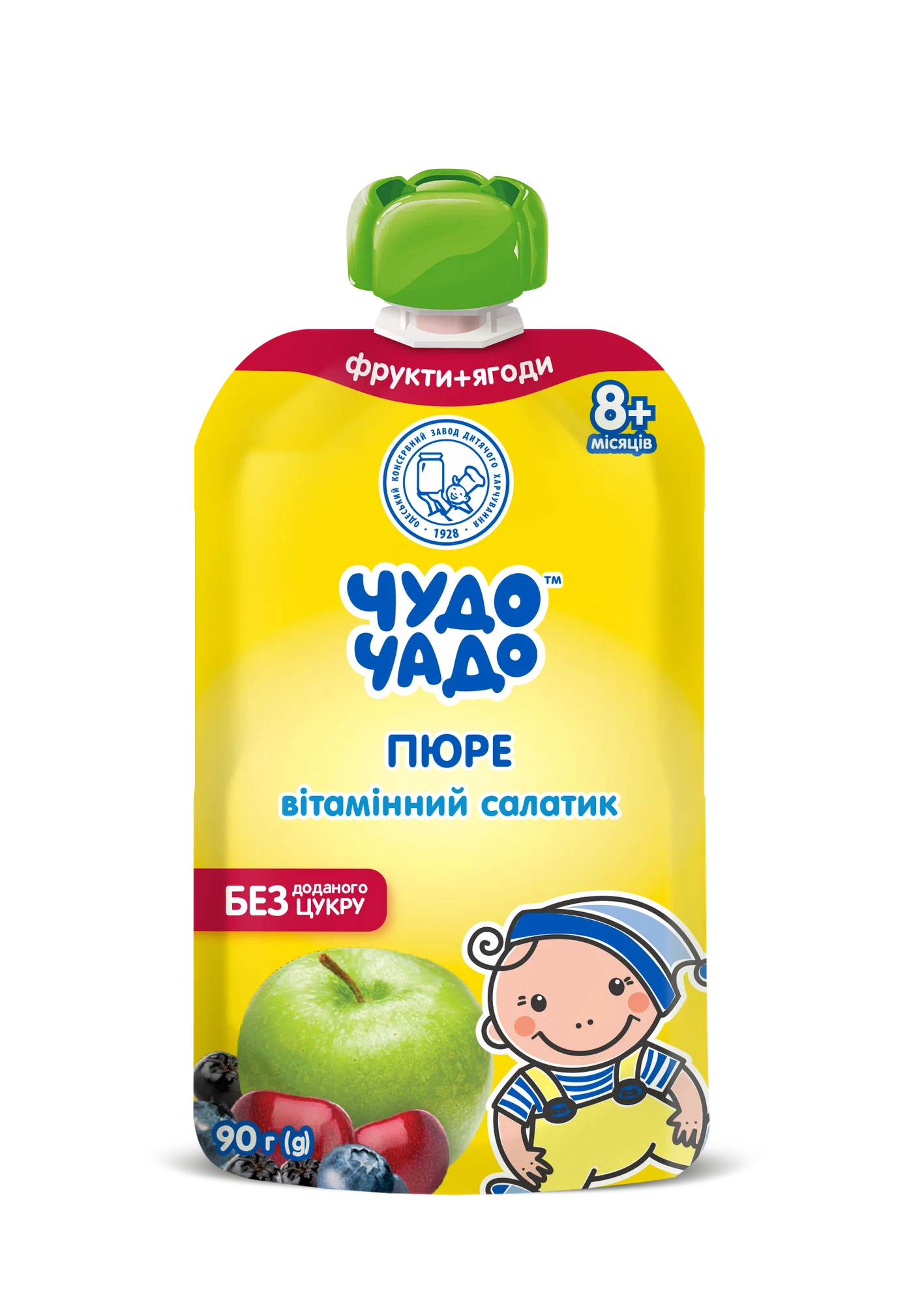 Фруктово-ягодное пюре «Чудо-Чадо» Витаминный салатик, 90 г – это полезный и вкусный продукт для детей с 8 месяцев. Изготовлено из натуральных ингредиентов: яблочного пюре, сока черноплодной рябины, вишневого сока и пюре из черники, без добавления сахара, консервантов, красителей и ГМО.Пюре обогащено витамином С (аскорбиновая кислота), который поддерживает иммунитет и способствует здоровому развитию малыша. Нежная однородная текстура и сбалансированный вкус делают его идеальным для прикорма.
