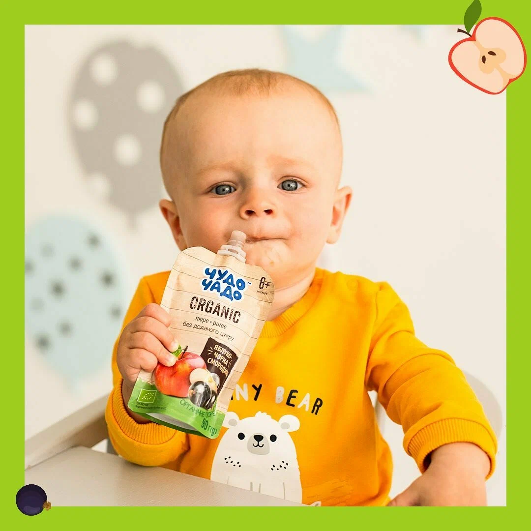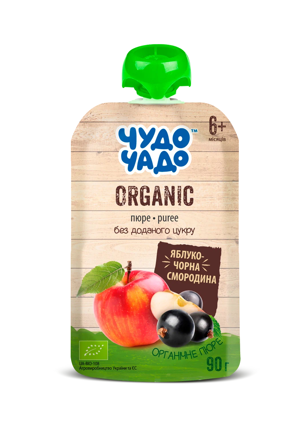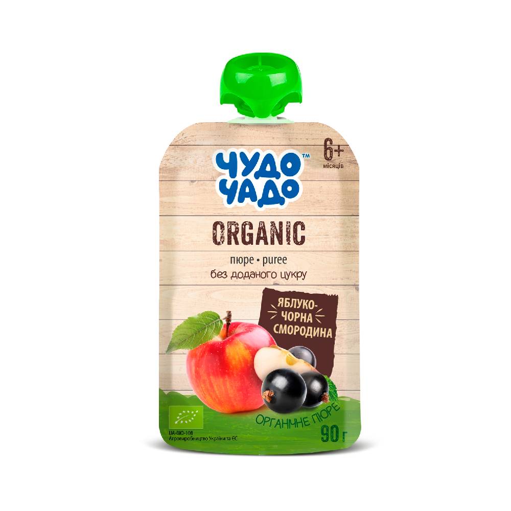 Органическое фруктово-ягодное пюре «Чудо-Чадо» яблоко-черная смородина, 90 г – это натуральный продукт для детей с 6 месяцев, произведенный из сертифицированных органических ингредиентов.