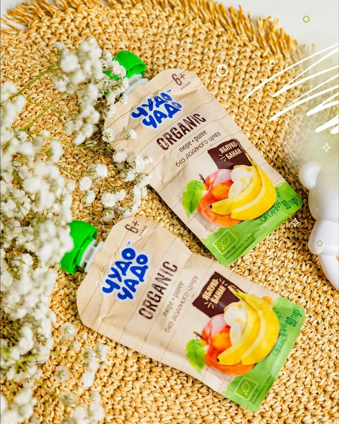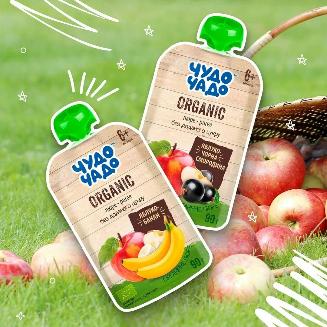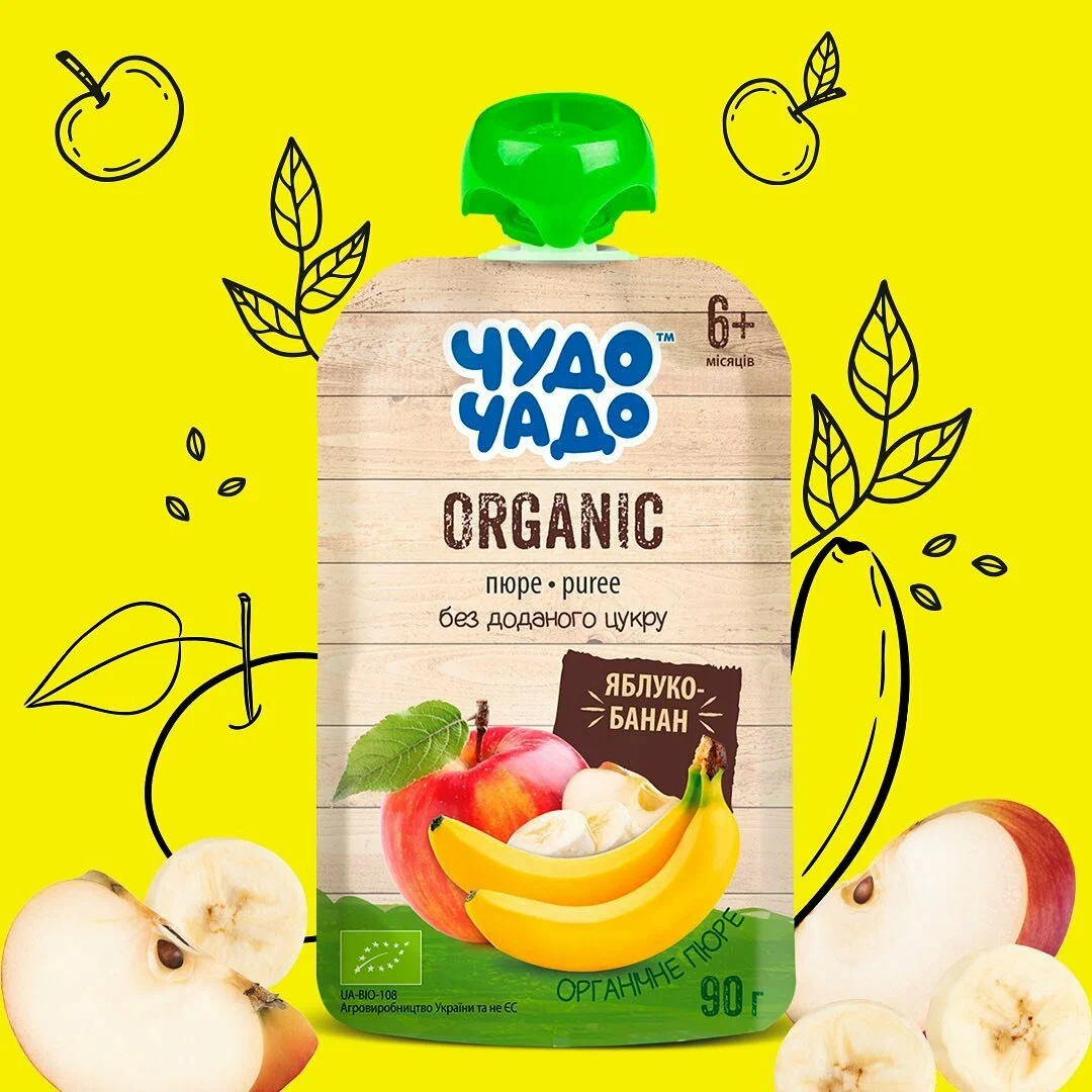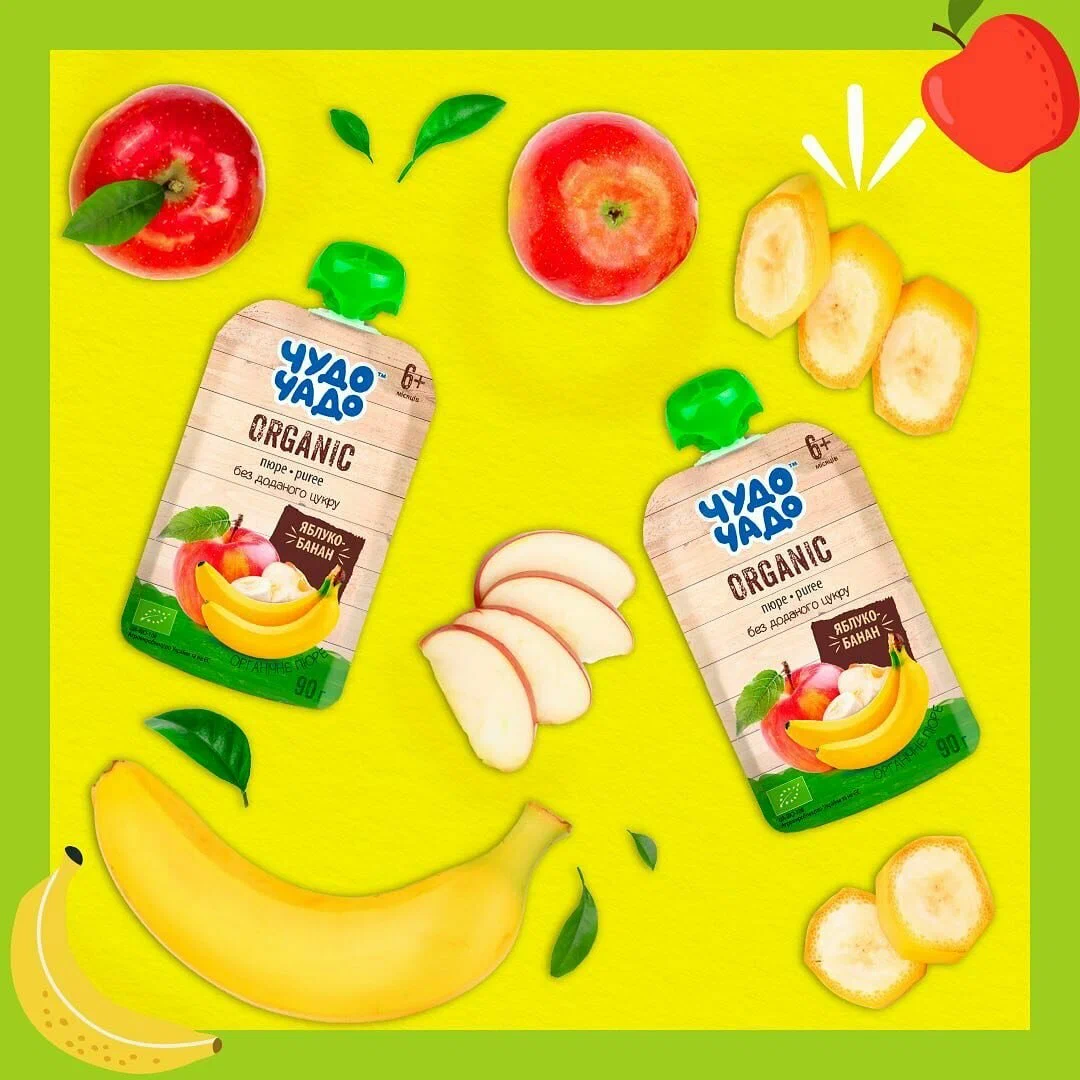 Органическое фруктовое пюре «Чудо-Чадо» яблоко-банан, 90 г – это экологически чистый продукт для детского питания, предназначенный для малышей с 6 месяцев. Изготовлено из сертифицированных органических яблок и бананов, выращенных без использования химических удобрений, пестицидов и ГМО. Не содержит сахара, консервантов и искусственных добавок.