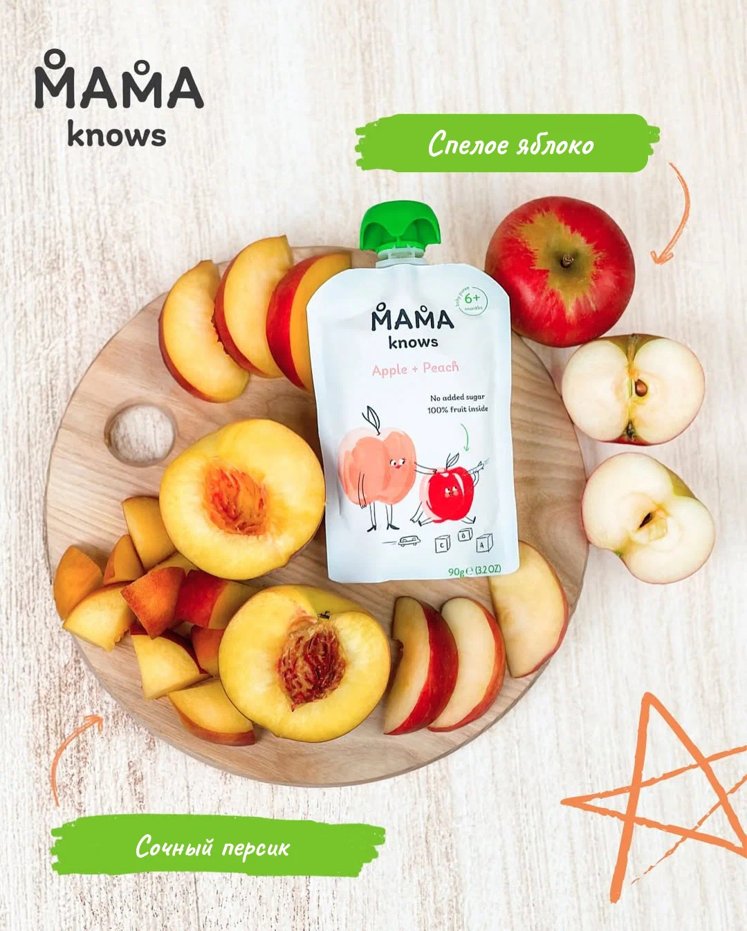 Каждая мама знает, что лучше для ее ребенка. За наш 70-летний опыт производства детского питания мы собрали необходимые для производства лучшего детского питания знания, чтобы помочь мамам и сделать кормление полезным, легким и всегда вкусным.Фруктовое пюре «Mama Knows» яблоко-персик - это натуральный продукт для детского питания, разработанный для малышей с 6 месяцев. Изготовлено из спелых яблок и сочных персиков без добавления сахара, консервантов, красителей и ГМО.