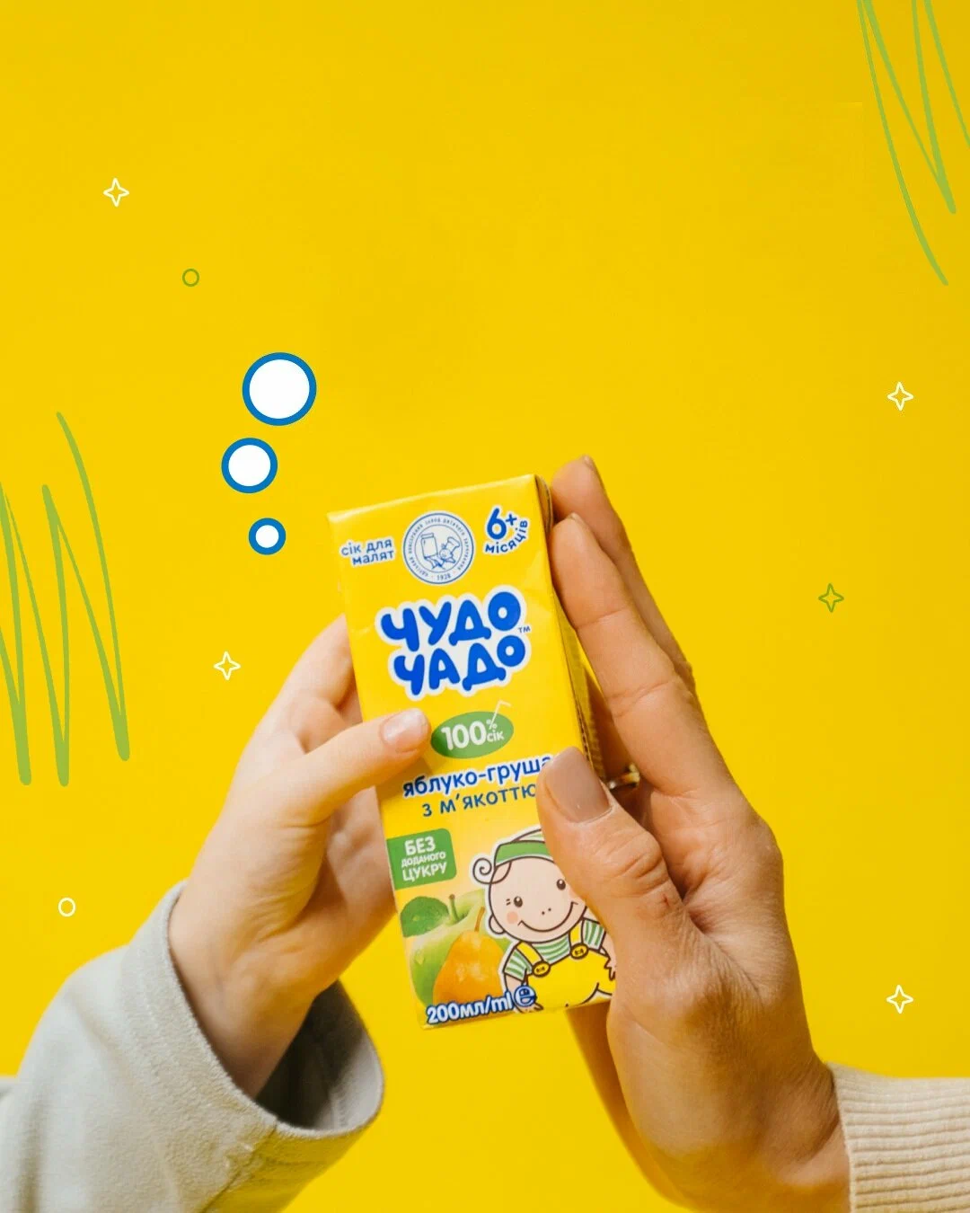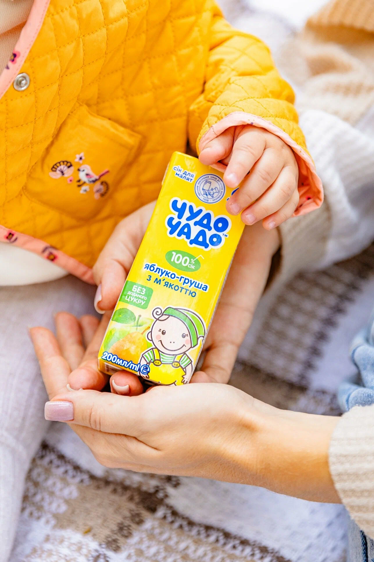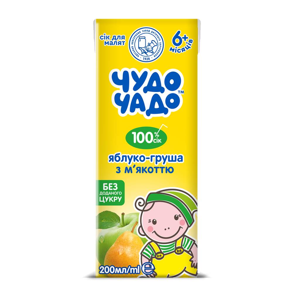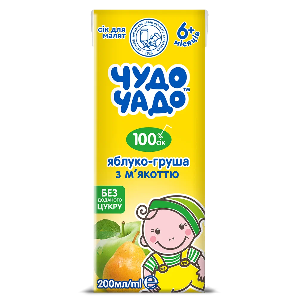 Яблочно-грушевый сок с мякотью «Чудо-Чадо» без сахара, 200 мл – это натуральный продукт для детского питания, предназначенный для детей с 6 месяцев. Изготовлен из спелых украинских яблок и груш без добавления сахара, красителей, консервантов и ГМО.