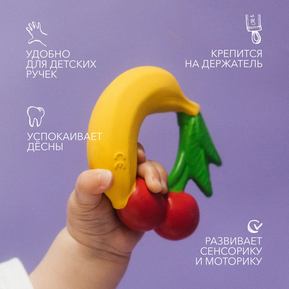 Игрушка-прорезыватель "Фрукт" идеально подходит для новорожденных. Изготовлено из 100% натурального каучука и расписано вручную безопасными натуральными пигментами. Кольцо имеет яркие цвета, детализированную текстуру и эргономичную форму, которые стимулируют чувства ребёнка и успокаивают десны при прорезывании зубов.