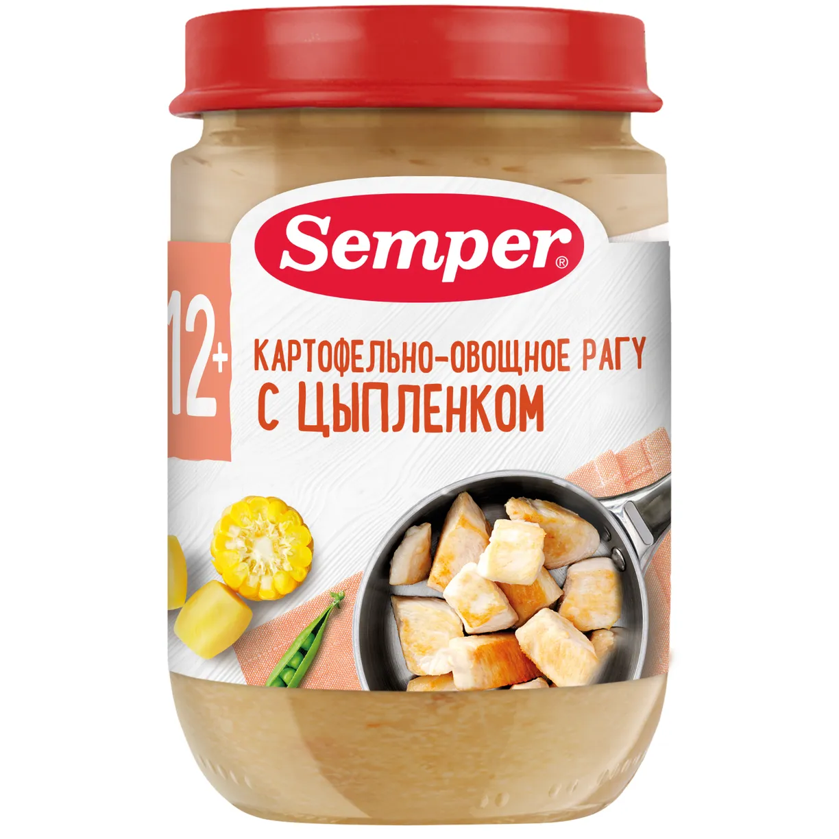 Детское пюре с кусочками Картофельно-овощное рагу с цыпленком с 12 месяцев — уникальное готовое мясное блюдо на обед или ужин для детей от Semper.